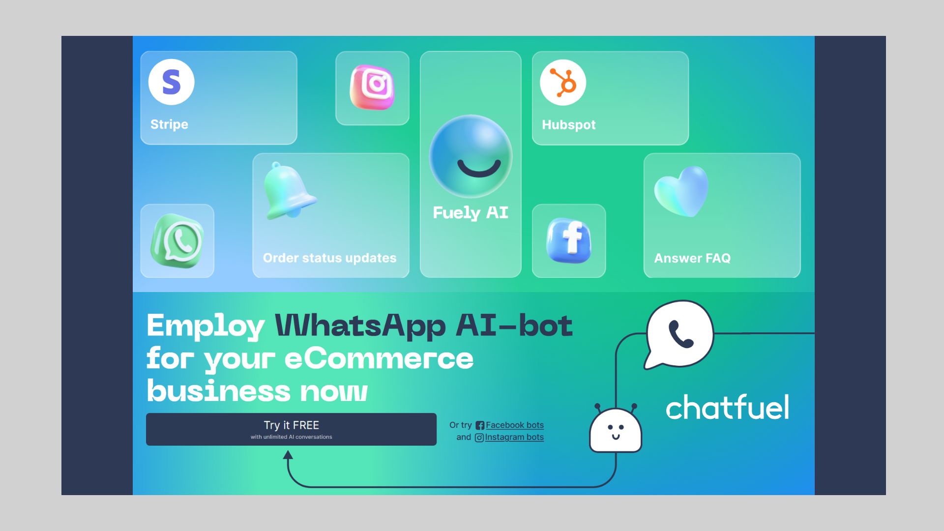 פלטפורמת Chatfuel מאפשרת לעסקים לבנות צ’טבוטים חזקים ללא צורך בכתיבת קוד. בעזרת ממשק ויזואלי ויכולות אינטגרציה מרשימות פלטפורמה זו מספקת פתרונות אוטומציה לשיחות שיווק ותמיכה בלקוחות בערוצי מסר כמו WhatsApp, Messenger ו-Instagram.